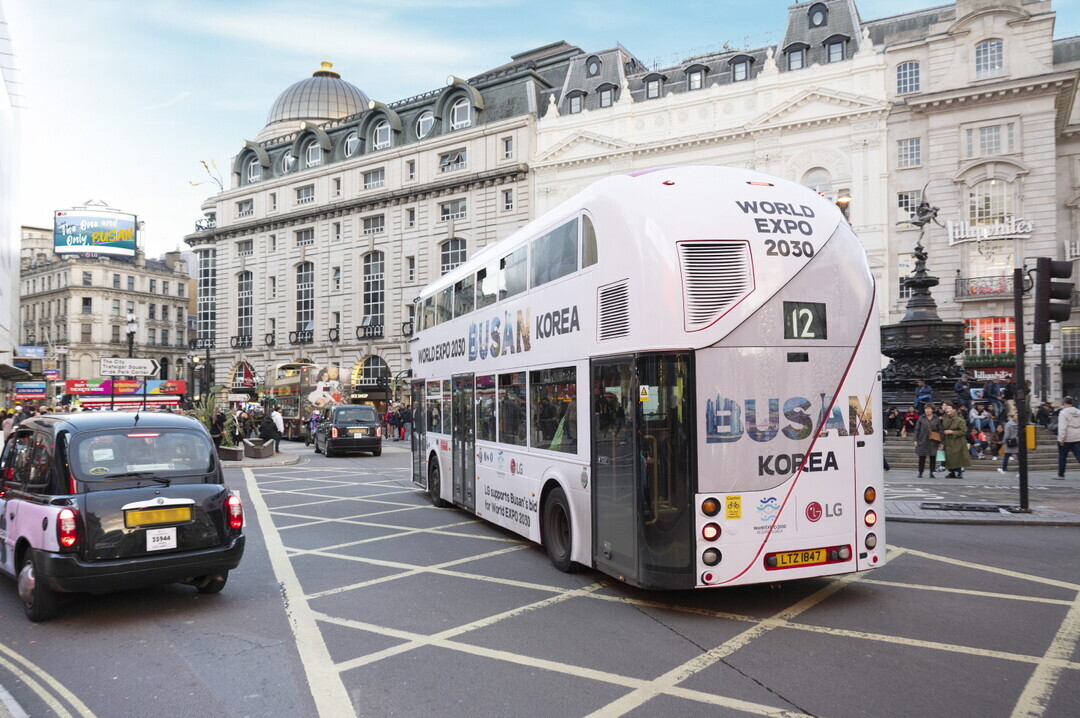 | ▲ 'LG 엑스포 버스'가 영국 런던 피카딜리 광장을 지나는 모습. 사진 왼쪽 대형 전광판에는 LG의 '2030 부산엑스포' 유치 홍보 영상이 상영되고 있다. [LG 제공] |