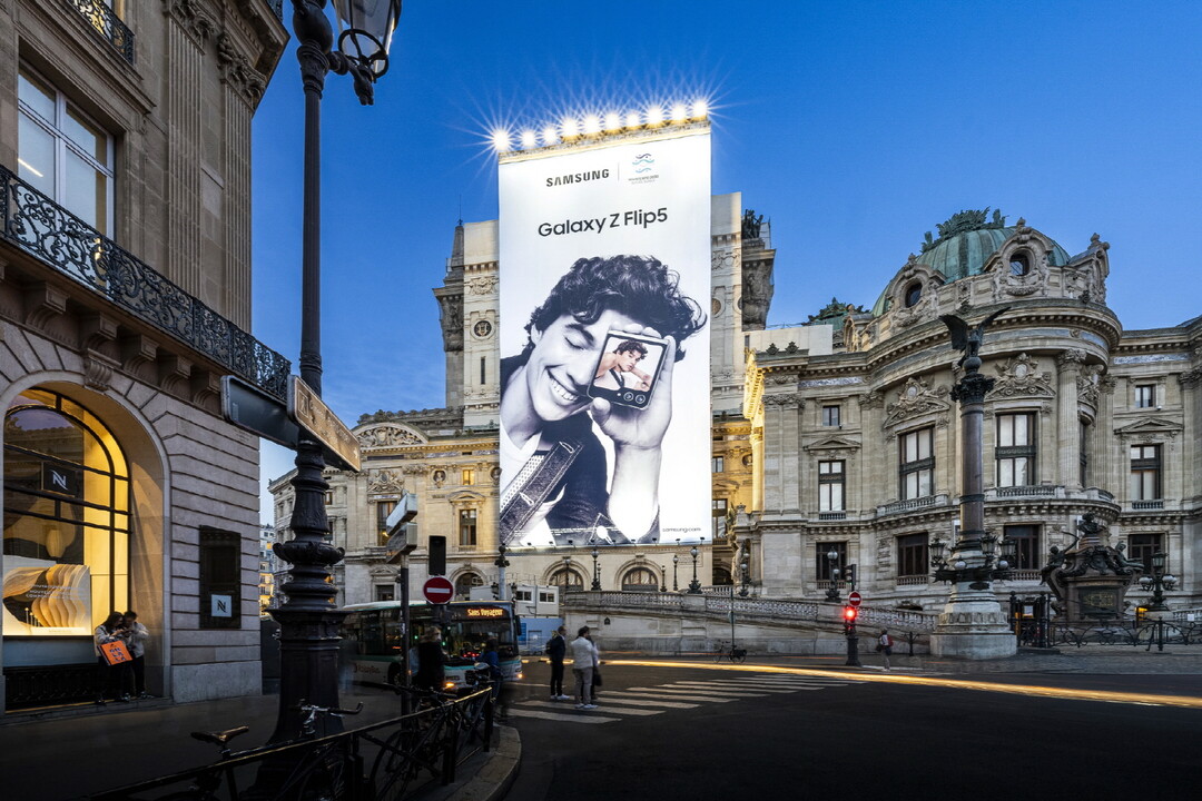 | ▲ 삼성전자가 파리의 명소 '오페라 가르니에'의 대형 옥외광고로 선보인 부산엑스포 로고. '갤럭시 Z 플립5' 이미지에 부산엑스포 로고가 함께 있다. [삼성전자 제공] |