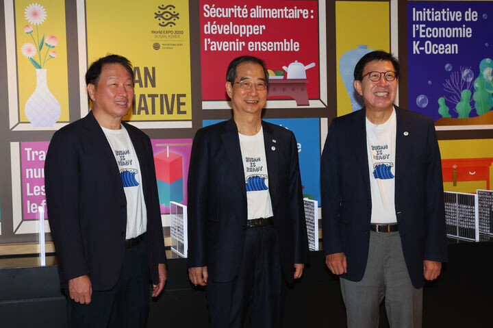 | ▲ 프랑스 파리에서 'Busan is ready' 티셔츠를 입고 유치활동을 벌이는 한덕수(가운데) 국무총리와 박형준(오른쪽) 부산시장, 최태원 대한상의 회장. [국무총리실] |