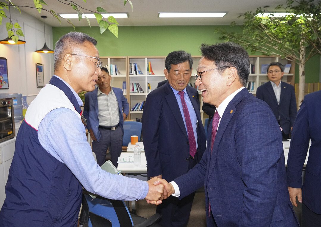 | ▲ 강기정 광주광역시장이 26일 오후 하남혁신지원센터에서 열린 '민주노총 광주본부 사무실 개소식'에 참석해 이종욱 본부장과 인사를 나누고 있다. [광주광역시 제공] |