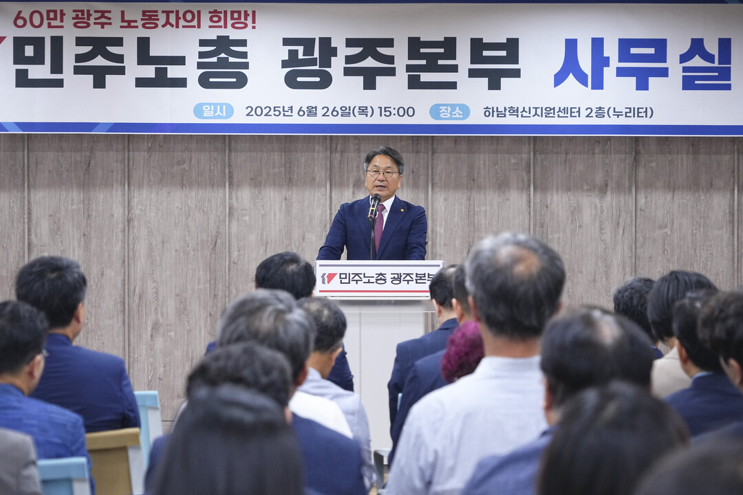 | ▲ 강기정 광주광역시장이 26일 오후 하남혁신지원센터에서 열린 '민주노총 광주본부 사무실 개소식'에 참석해 격려사를 하고 있다. [광주광역시 제공] |