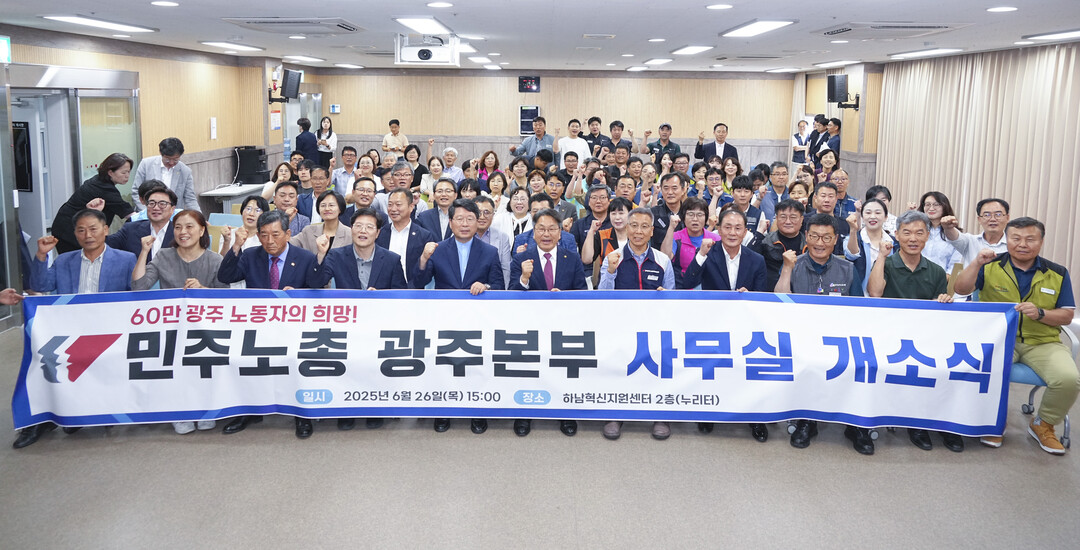 | ▲ 강기정 광주광역시장이 26일 오후 하남혁신지원센터에서 열린 '민주노총 광주본부 사무실 개소식'에 참석해 이종욱 본부장 등 내빈들과 기념촬영을 하고 있다. [광주광역시 제공] |