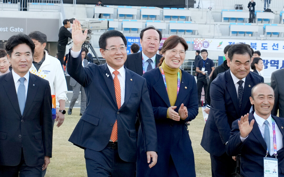 | ▲ 김영록 전라남도지사와 장미란 문화체육관광부 제2차관이 3일 오후 목포종합경기장에서 열린 제43회 전국장애인체육대회 개회식에 입장하고 있다. [전남도 제공] |