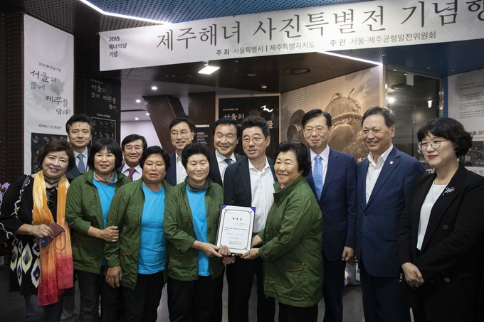 2019 해녀의 날 기념 '서울의 품에 제주를 담다' 사진특별전이 23일 오후 서울시청에서 열린 가운데 바른미래당 손학규 대표, 조현배 해양경찰청장, 사진가 양종훈(상명대 교수), 제주 해녀 등 참석자들이 기념촬영을 하고 있다. 이번 전시회는 유네스코에 등재된 한국의 19번째 인류무형문화유산인 제주 해녀들의 삶과 애환, 생활과 문화를 사진가 양종훈이 사진으로 생생하게 기록한 이미지텔링 전시다.