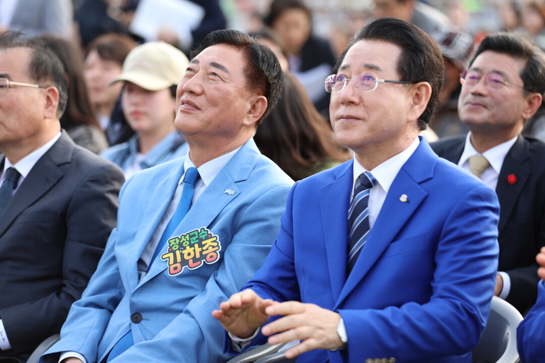 | ▲ 김영록(오른쪽) 전남지사와 김한종 장성군수가 18일 전남 장성 옐로우시티 스타디움에서 열린 제64회 전라남도체육대회 개회식에서 성화 점화를 지켜보며 박수를 보내고 있다. [강성명 기자] |