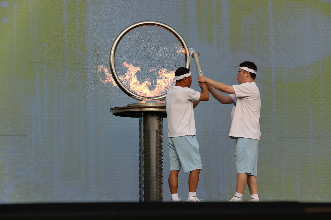 | ▲ 최종 성화주자인 김용율 전남도청 펜싱팀 감독과 장성군 홍보대사 유튜버 감스트가 18일 전남 장성 옐로우시티 스타디움에서 열린 제64회 전라남도체육대회 개회식에서 성화를 점화하고 있다. [강성명 기자] |