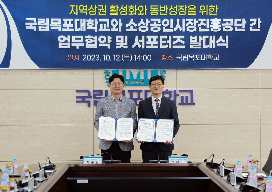 국립목포대학교가 12일 스마트회의실에서 소상공인시장진흥공단 목포센터와 ‘지역 상권활성화와 동반성장을 위한 업무협약과 대학생 서포터즈 발대식’을 개최했다.
