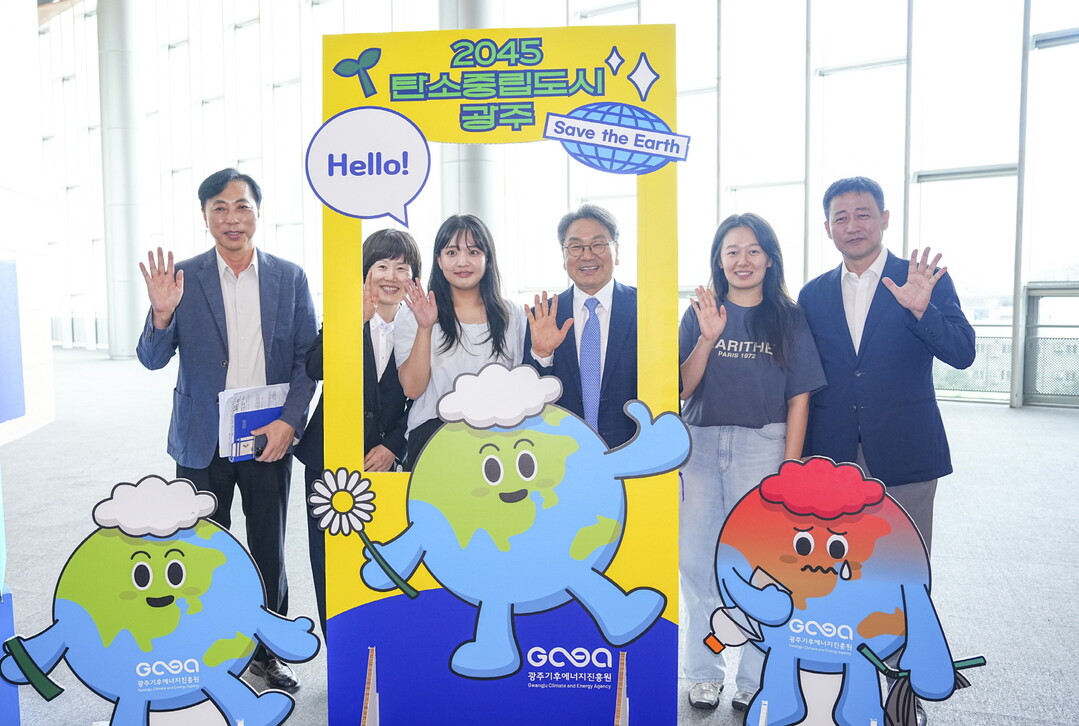 | ▲ 강기정 광주광역시장이 13일 오후 서구 김대중컨벤션센터에서 열린 탄소중립 시민실천단 '빛고을 넷제로 프렌즈 발대식'에 참석해 고상연 광주기후에너지진흥원장 등 직원들과 홍보판을 배경으로 기념촬영을 하고 있다. [광주광역시 제공] |