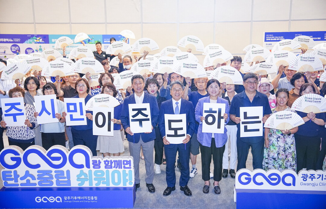 | ▲ 강기정 광주광역시장이 13일 오후 서구 김대중컨벤션센터에서 열린 탄소중립 시민실천단 '빛고을 넷제로 프렌즈 발대식'에서 참석자들과 퍼포먼스를 하고 있다. [광주광역시 제공] |
