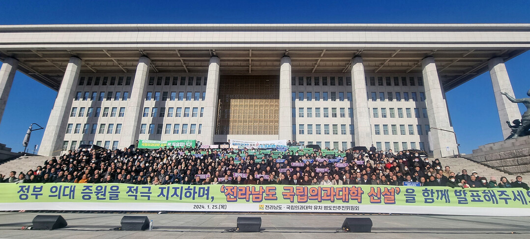 | ▲ 지난 1월 25일 국회의사당 앞에서 전라남도 국립의과대학 유치 범도민 추진위원회가 국립의과대학 신설을 해달라고 공동선언에 나서고 있다. [목포대 제공] |