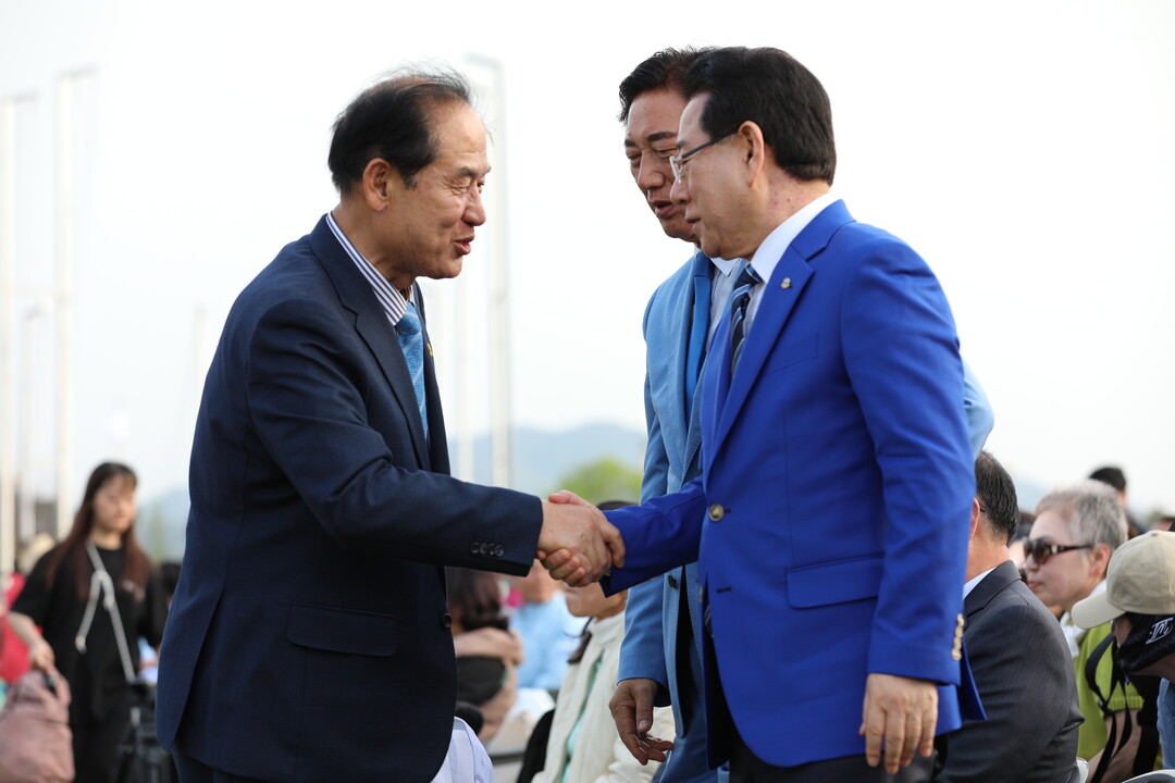 | ▲ 18일 전남 장성 옐로우시티 스타디움에서 열린 제64회 전라남도체육대회 개회식에 참석한 김희수(왼쪽) 진도군수가 김영록 전남지사·김한종 장성군수와 악수를 하고 있다. [강성명 기자] |