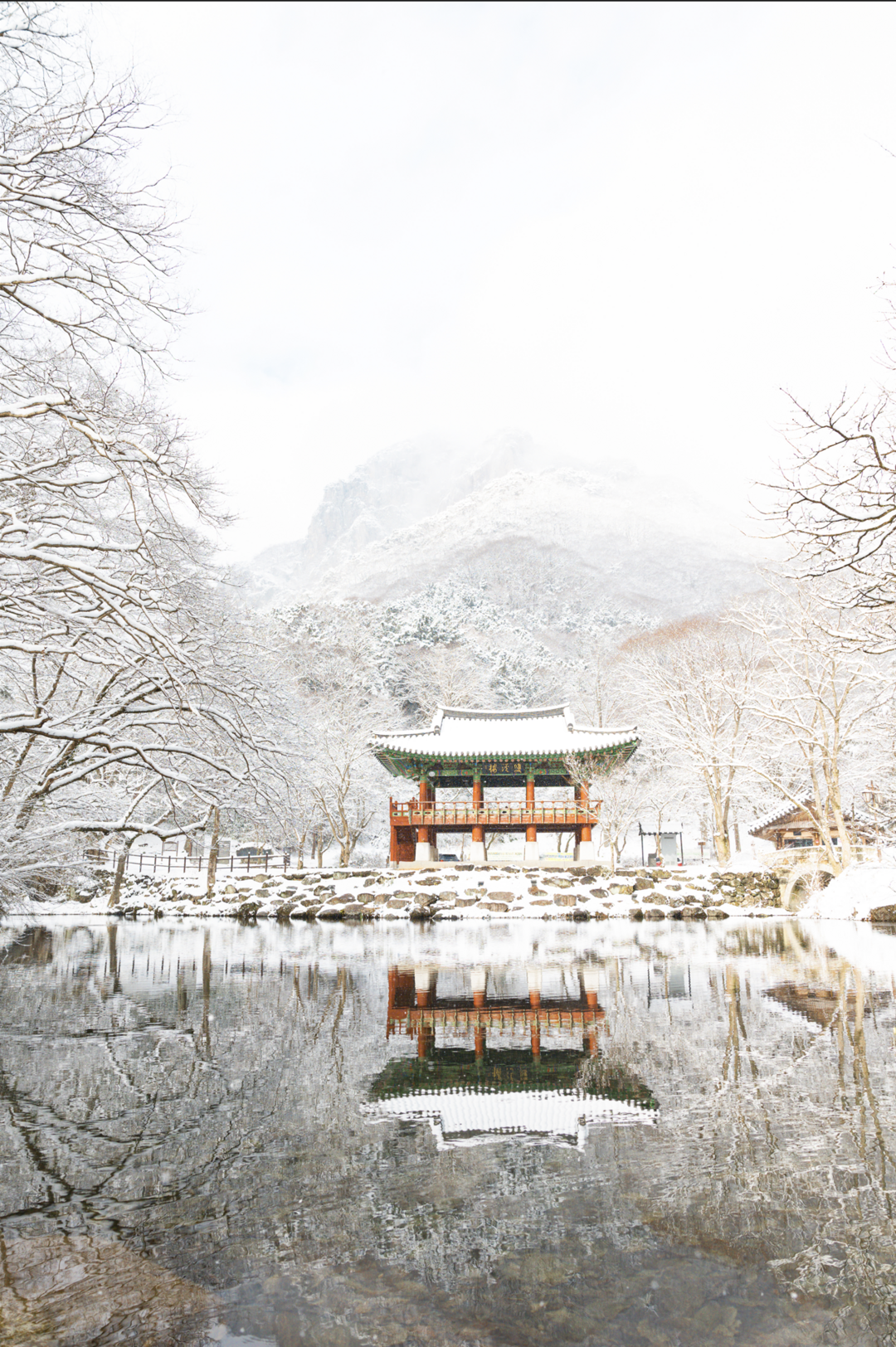 ▲ 7일 전남 장성군 백양사 쌍계루에 흰 눈이 쌓여 한 폭의 수묵화가 그려진듯 고즈넉한 풍경을 연출하고 있다. [장성군 제공]