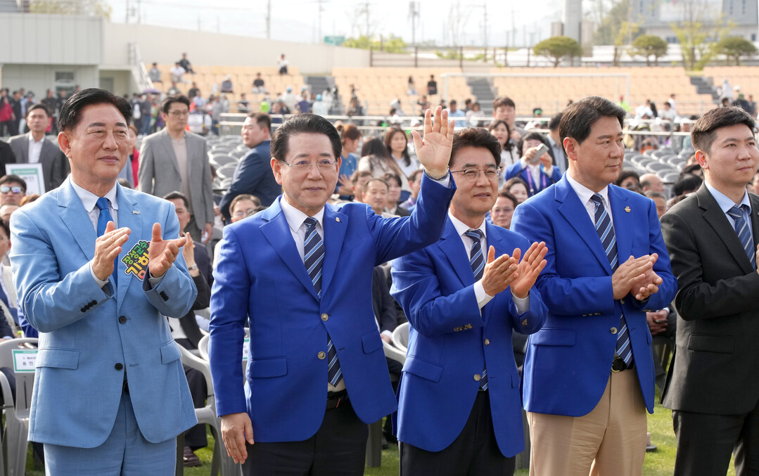 | ▲ 18일 장성 옐로우시티 스타디움에서 열린 '제64회 전라남도체육대회' 개막식에서 김영록 전남지사와 김한종 장성군수, 김태균 전남도의회 의장이 입장하는 선수를 환영하고 있다. [전남도 제공] |