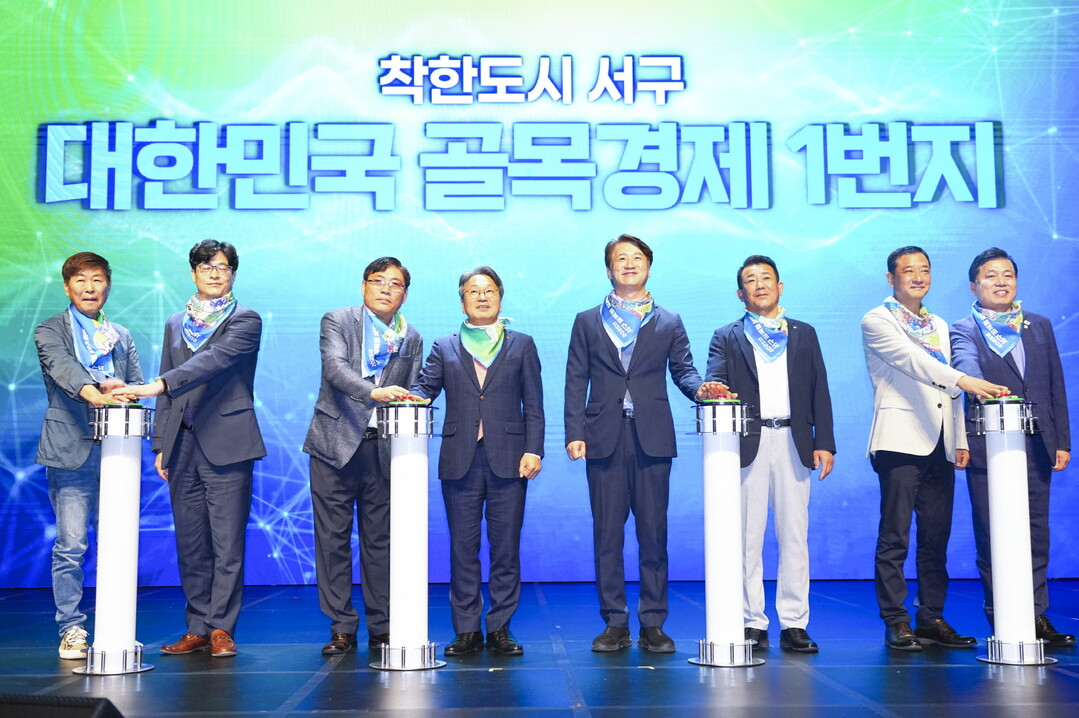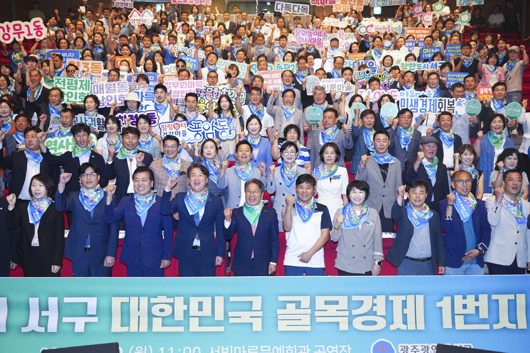 | ▲ 강기정 광주광역시장이 30일 오전 서구 서빛마루문예회관 공연장에서 열린 '대한민국 골목경제 1번지 선포식'에 참석해 김이강 서구청장 등 내빈들과 퍼포먼스를 하고 있다. [광주광역시 제공] |