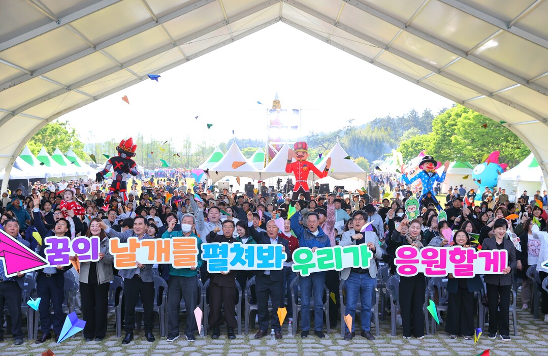 | ▲ 명현관 전남 해남군수가 3일 '2025 해남공룡대축제' 개막식에서 어린이날을 맞아 '꿈의 날개를 펼쳐봐 우리가 응원할께'란 손푯말을 활용한 퍼포먼스를 하고 있다. [해남군 제공] |