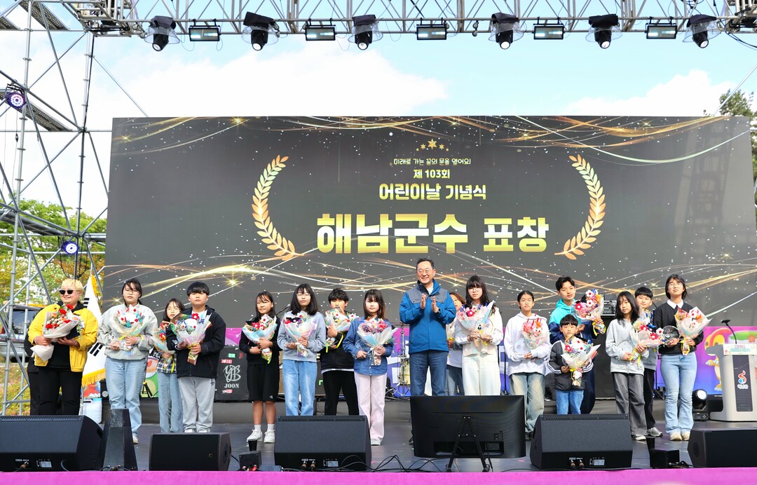 | ▲ 명현관 전남 해남군수가 3일 '2025 해남공룡대축제' 개막식에서 어린이날 기념 해남군수 표창을 한 뒤 수상자들과 함께 기념촬영을 하고 있다. [해남군 제공] |