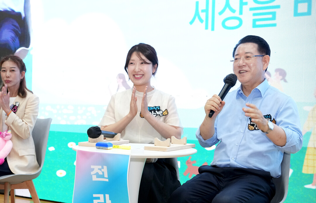 | ▲ 김영록 전라남도지사가 30일 오후 도청 왕인실에서 열린 전남 가족친화문화 확산 '가족행복콘서트' 행사에서 아이들과 가족 및 일상에 대한 이야기를 나누는 '세상을 바꾸는 아이들의 퀴즈쇼'에 참여, 질문에 대한 답변을 하고 있다. [전남도 제공] |