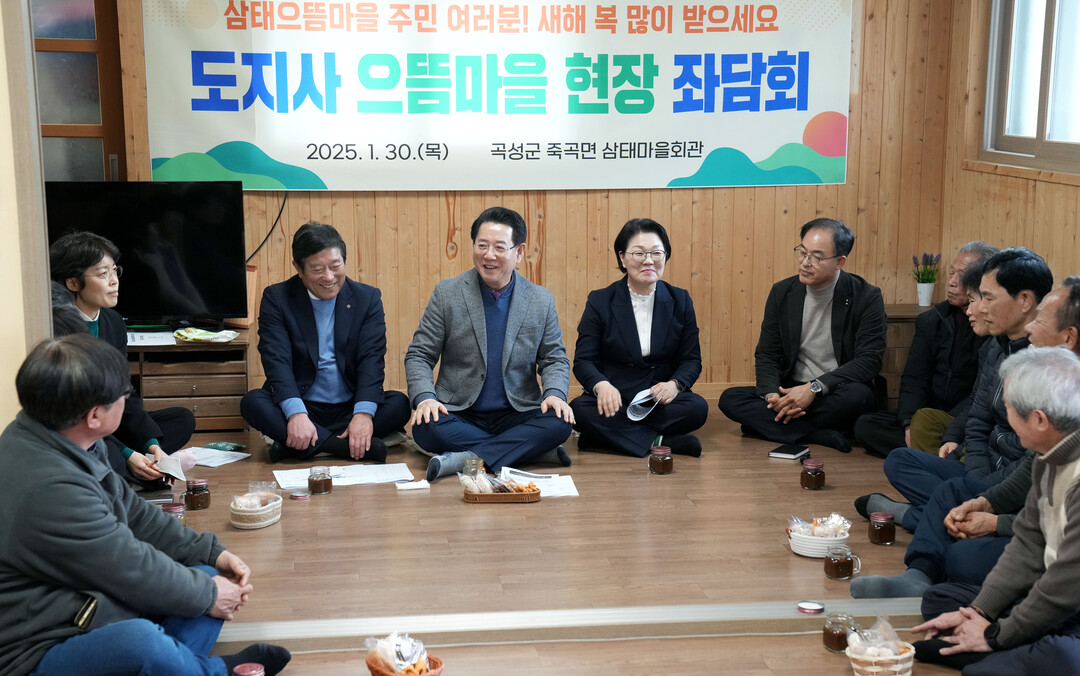 | ▲ 김영록 전라남도지사가 30일 곡성 죽곡면 삼태마을을 방문, 마을주민 애로사항 및 건의사항을 청취하고 2024년 마을공동체 최우수마을로 선정된 것에 대해 축하의 말을 전하고 있다. [전남도 제공] |