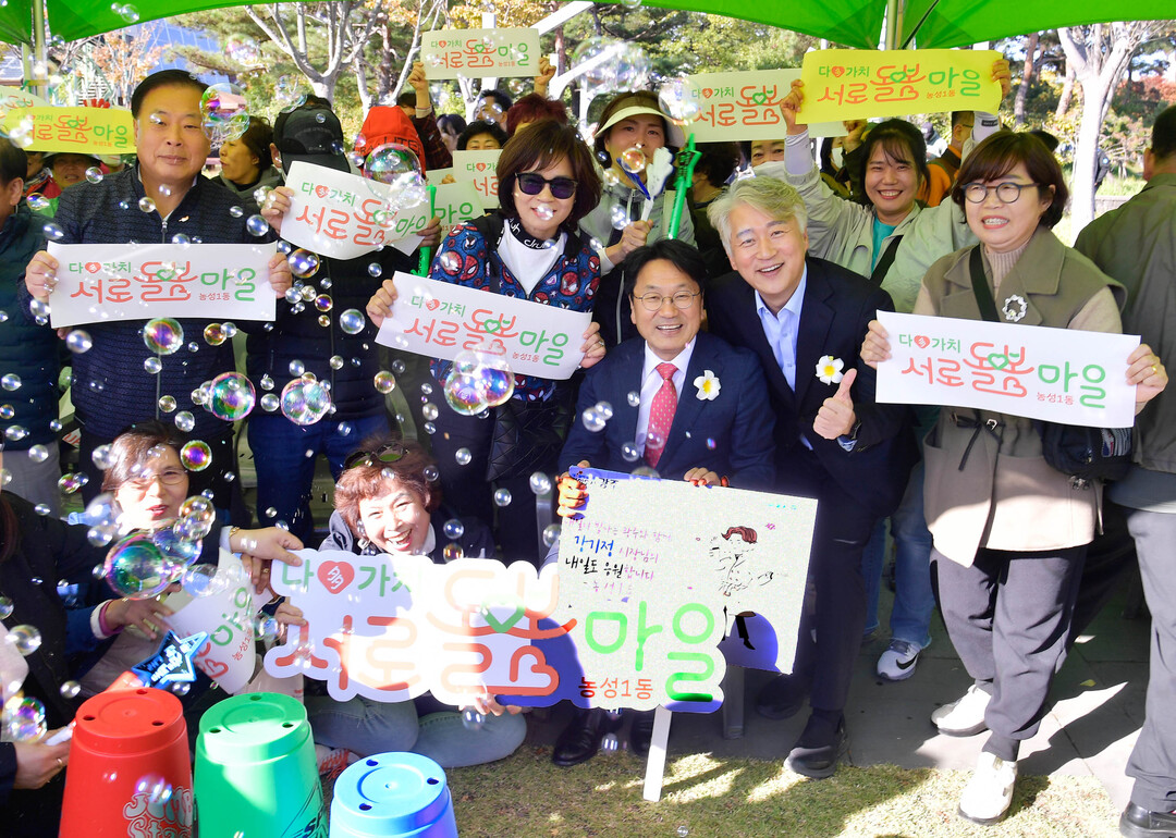 | ▲ 강기정 광주광역시장이 20일 오후 서구 상무공원에서 열린 '서구 어울림한마당 축제'에 참석해 김이강 서구청장과 마을부스를 돌며 주민들과 기념촬영을 하고 있다. [광주광역시 제공] |