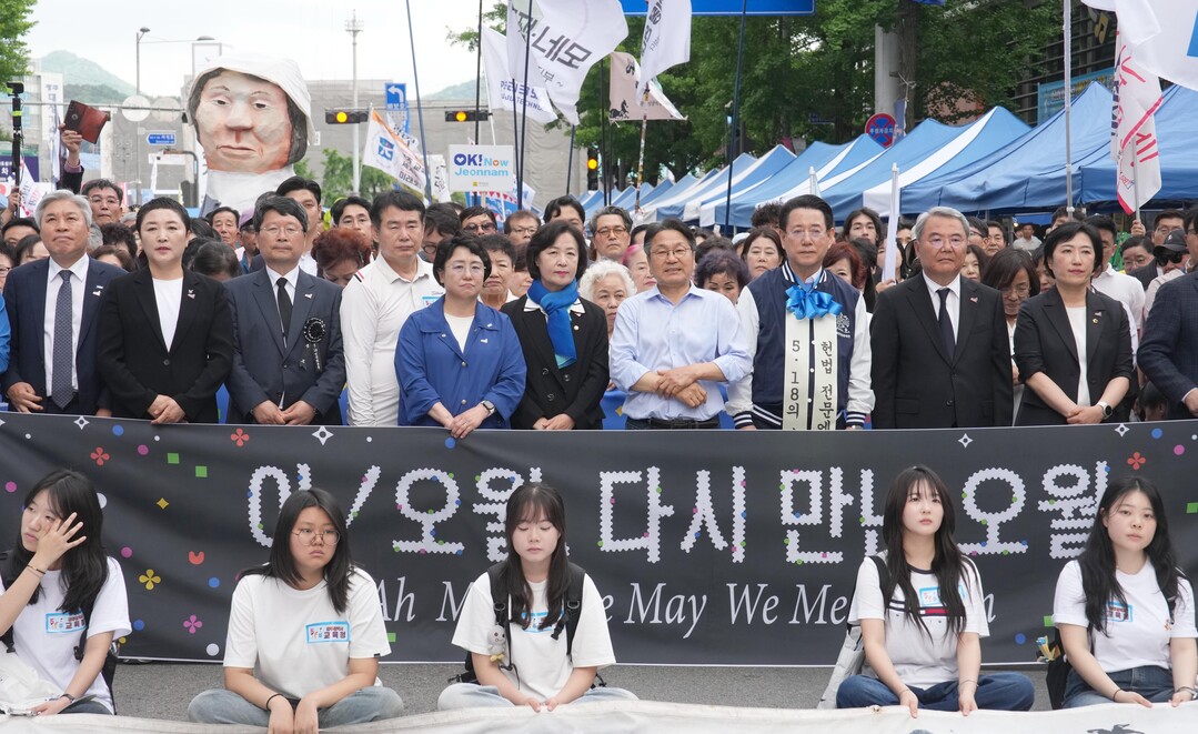 | ▲ 김영록 전라남도지사를 비롯한 강기정 광주광역시장 등 시민들이 17일 오후 광주 동구 금남로에서 5·18 전야제 행사 중 하나인 민주평화대행진을 펼치고 있다. [전남도 제공] |