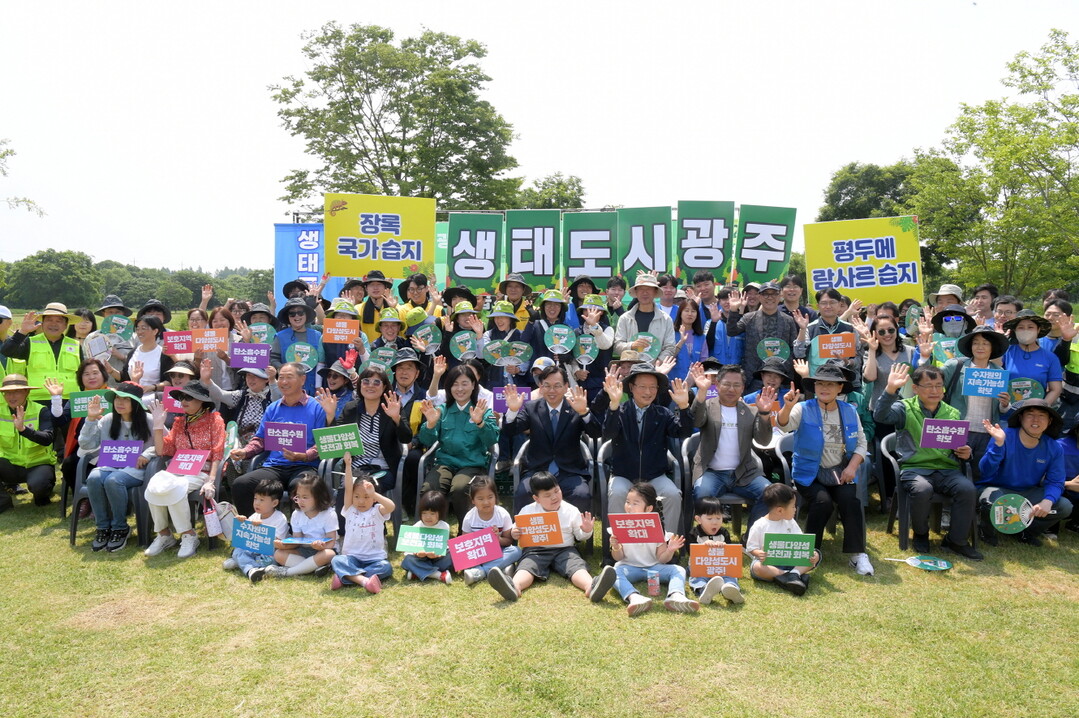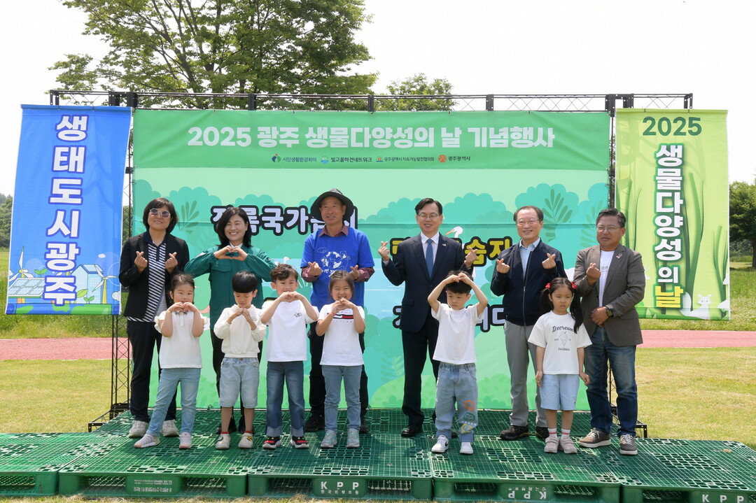 | ▲ 고광완 광주광역시 행정부시장이 26일 오전 광산구 선암동 황룡강 친수공원에서 열린 '2025 광주 생물다양성의 날' 기념행사에 참석해 참석자들과 함께 퍼포먼스를 하고 있다. [광주광역시 제공] |