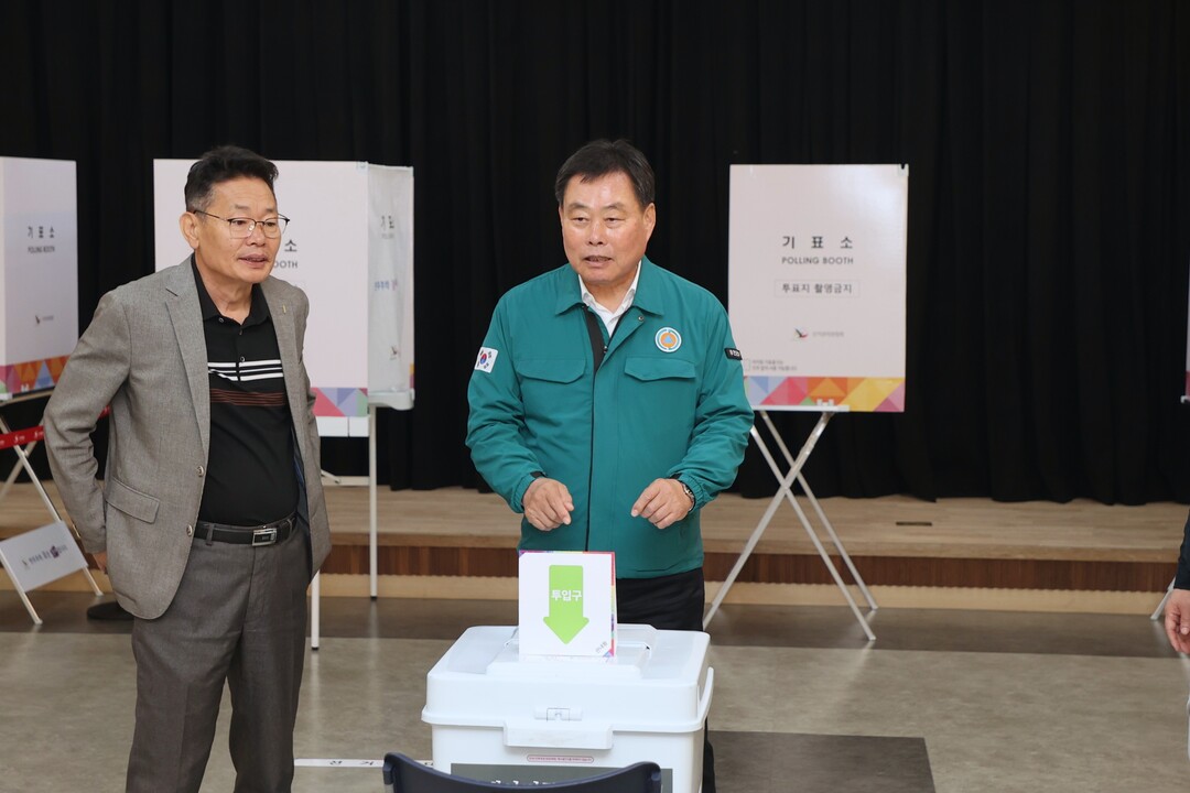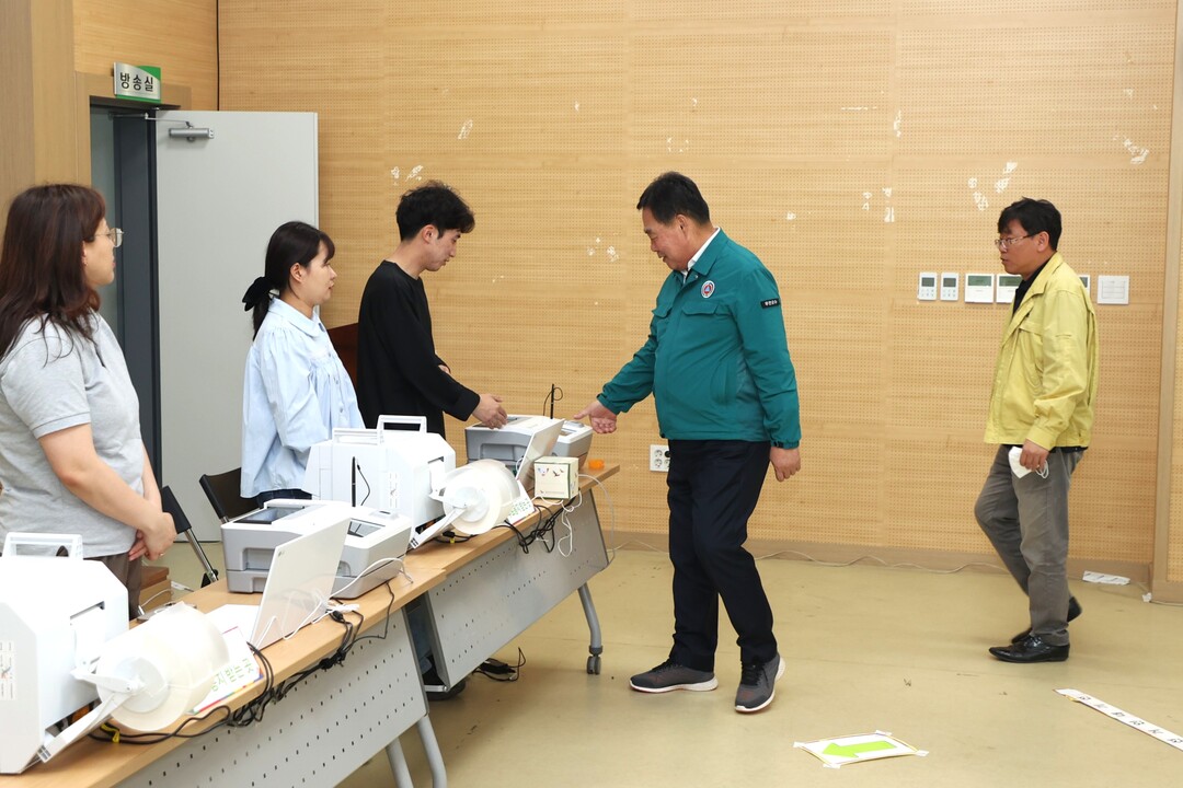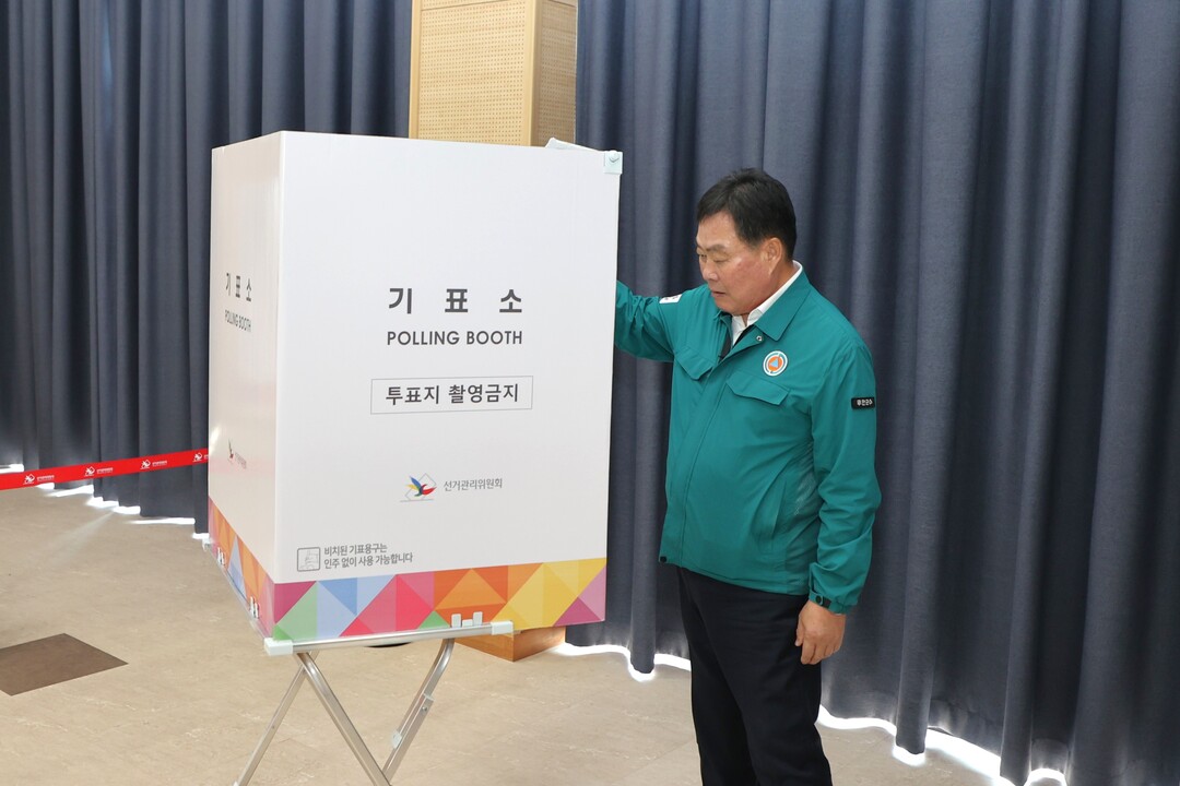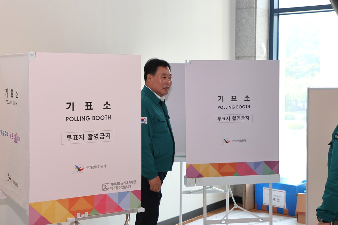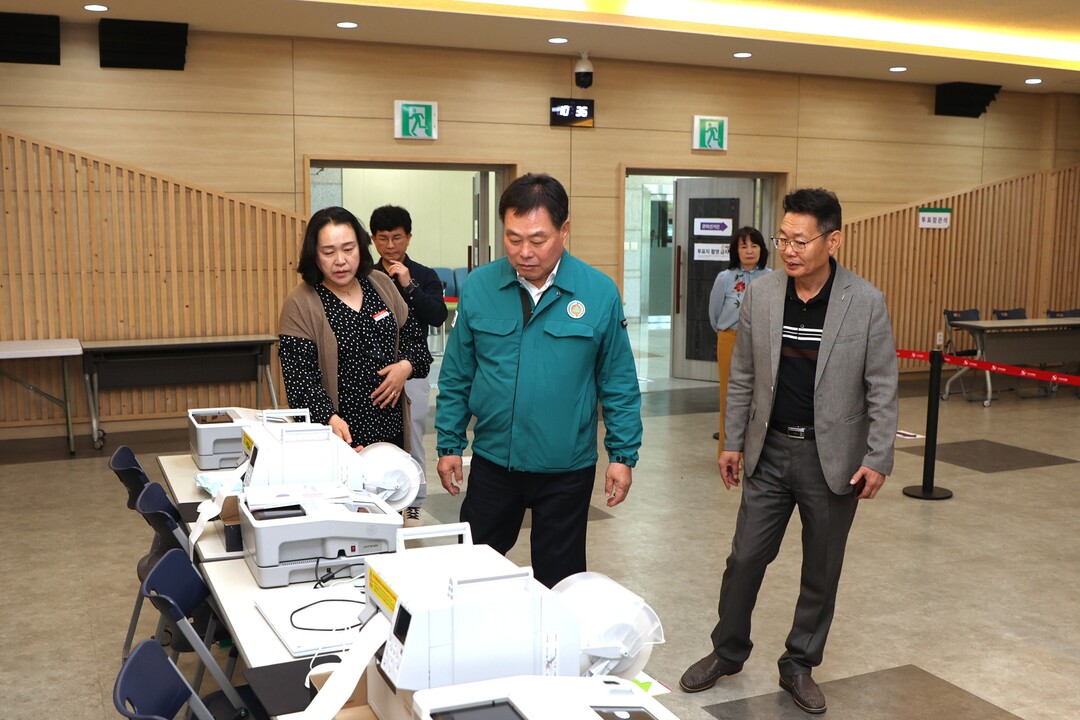 | ▲ 28일 김산 전남 무안군수가 제21대 대통령선거를 앞두고 군민들이 안전하고 편리하게 투표에 참여할 수 있도록 사전투표소 준비 상황을 점검하고 있다. 김 군수는 기표소 배치와 동선, 장애인 이동 편의 등 투표소 곳곳을 살폈다. [무안군 제공] |