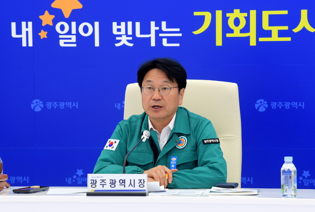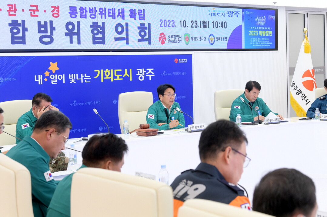 | ▲강기정 광주광역시장이 23일 오전 시청 충무시설에서 열린 화랑훈련 통합방위협의회에 참석해 인사말을 하고 있다. [광주광역시 제공] |