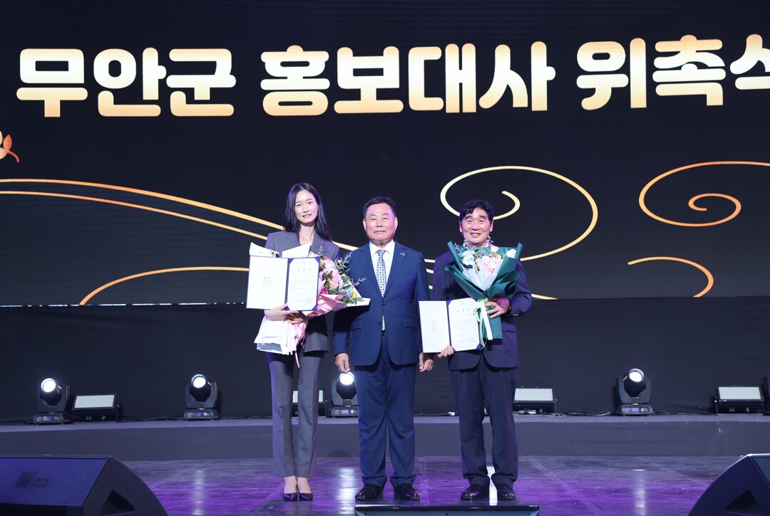 | ▲ 25일 김산 무안군수가 제27회 무안연꽃축제에서 무안읍 출신인 모델 '박세라 양'과 해제면 출신 '김형수' 전 구리시의회 의장을 제4·5호 무안군 홍보대사로 위촉한 뒤 기념촬영을 하고 있다. [무안군 제공] |