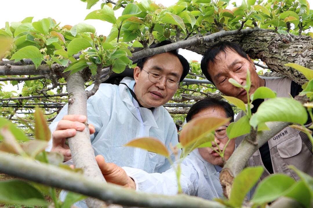 | ▲ 윤병태 나주시장이 24일 개화기 이상 저온으로 배꽃 냉해가 발생한 배 농가 현장을 방문해 농업인을 위로하며 피해 복구 대책을 논의했다. [나주시 제공] |