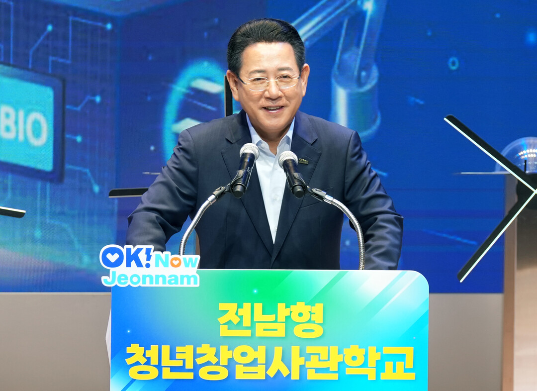 | ▲ 김영록 전라남도지사가 15일 전남동부청사 이순신강당에서 열린 '전남형 청년창업사관학교 입교식'에 참석, 환영사를 하고 있다. [전남도 제공] |