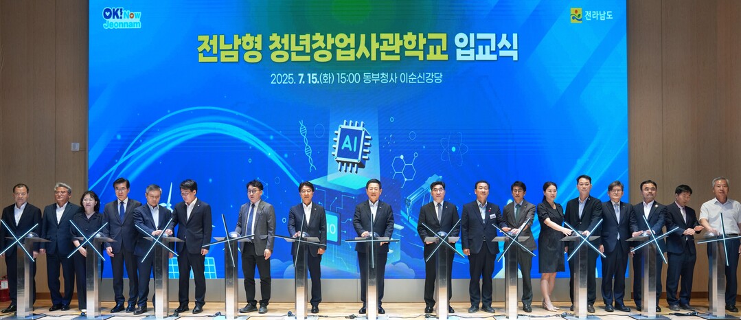 | ▲ 김영록 전라남도지사가 15일 전남동부청사 이순신강당에서 열린 '전남형 청년창업사관학교 입교식'에 참석, 주요내빈, 입교생과 기념촬영을 하고 있다. [전남도 제공] |