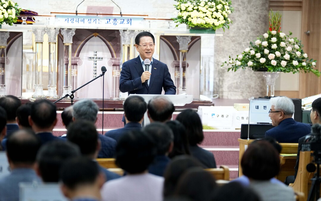 | ▲ 김영록 전라남도지사가 21일 고흥교회에서 열린 '2025 전라남도 기독공직자 선교대회'에 참석, 격려사를 하고 있다. [전남도 제공] |