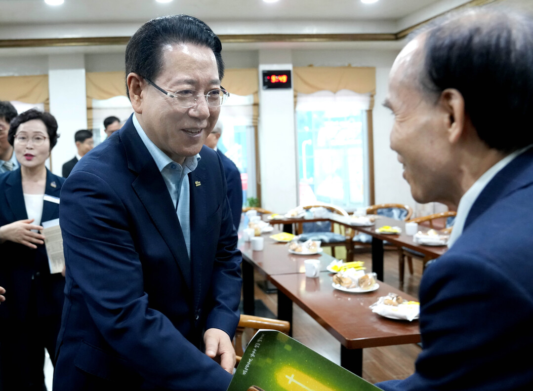 | ▲ 김영록 전라남도지사가 21일 고흥교회에서 열린 '2025 전라남도 기독공직자 선교대회'에 참석, 주요내빈들과 인사를 나누고 있다. [전남도 제공] |