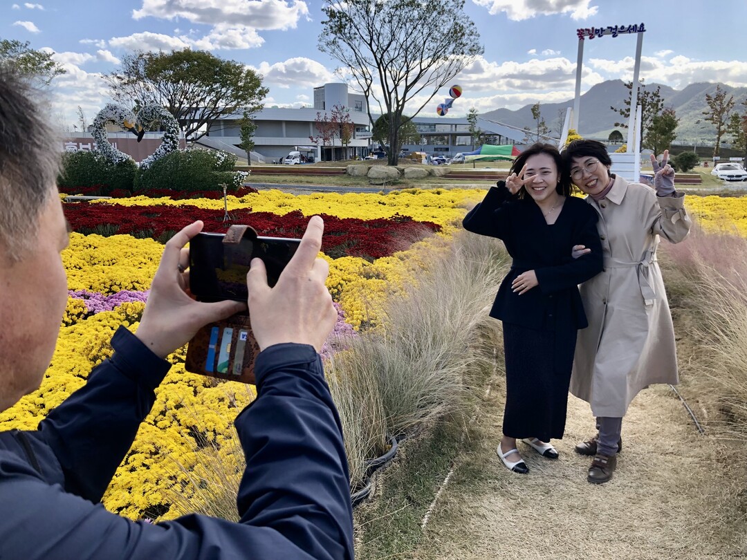 | ▲ 20일 강진만 생태공원에서 열리고 있는 ‘제8회 강진만 춤추는 갈대축제’ 현장에서 군청 직원과 관광객들이 갈대와 국화를 배경으로 추억을 남기고 있다. [강성명 기자] |
