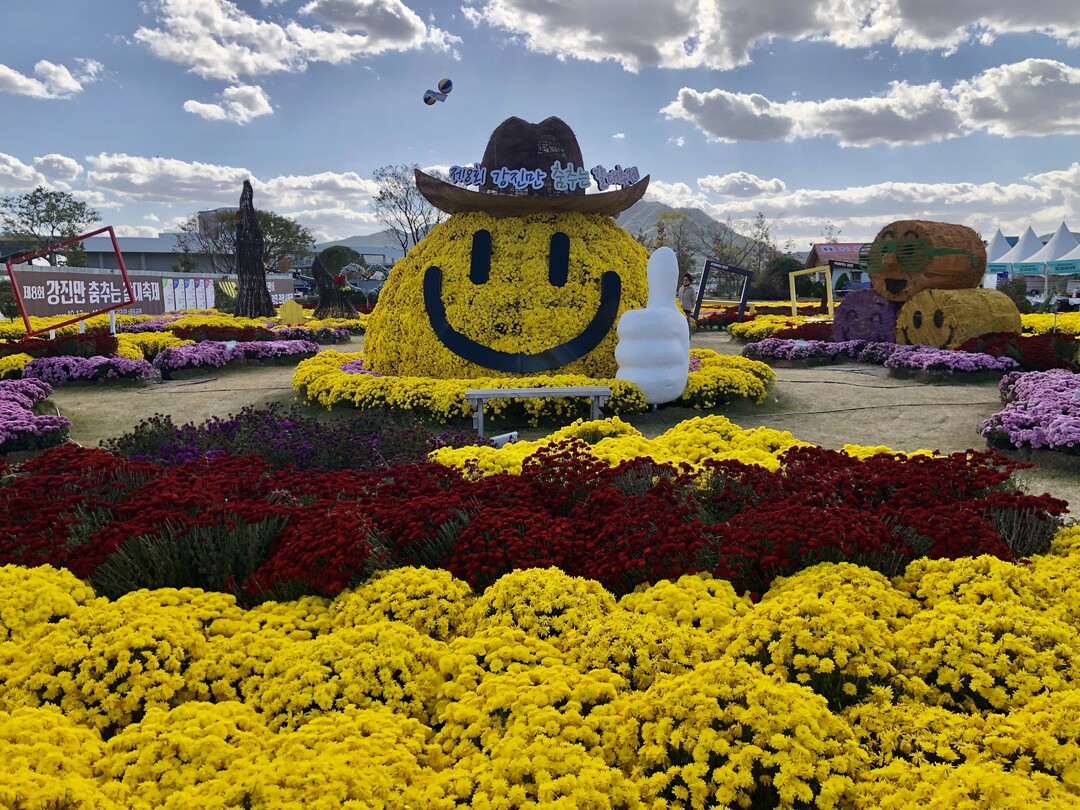 | ▲ 20일 강진만 생태공원에서 열리고 있는 ‘제8회 강진만 춤추는 갈대축제’ 현장에 대형 스마을 국화 전시물이 자리잡고 있다. [강성명 기자] |