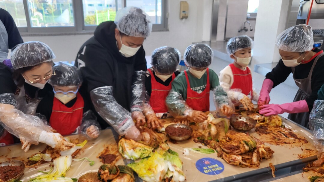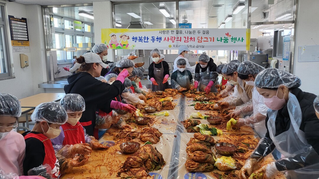 | ▲ 21일 목포서산초등학교 학생들이 급식실에서 사랑의 김치 담그기 나눔을 위해 고사리 같은 손으로 직접 김치를 버무리고 있다. [목포서산초 제공] |