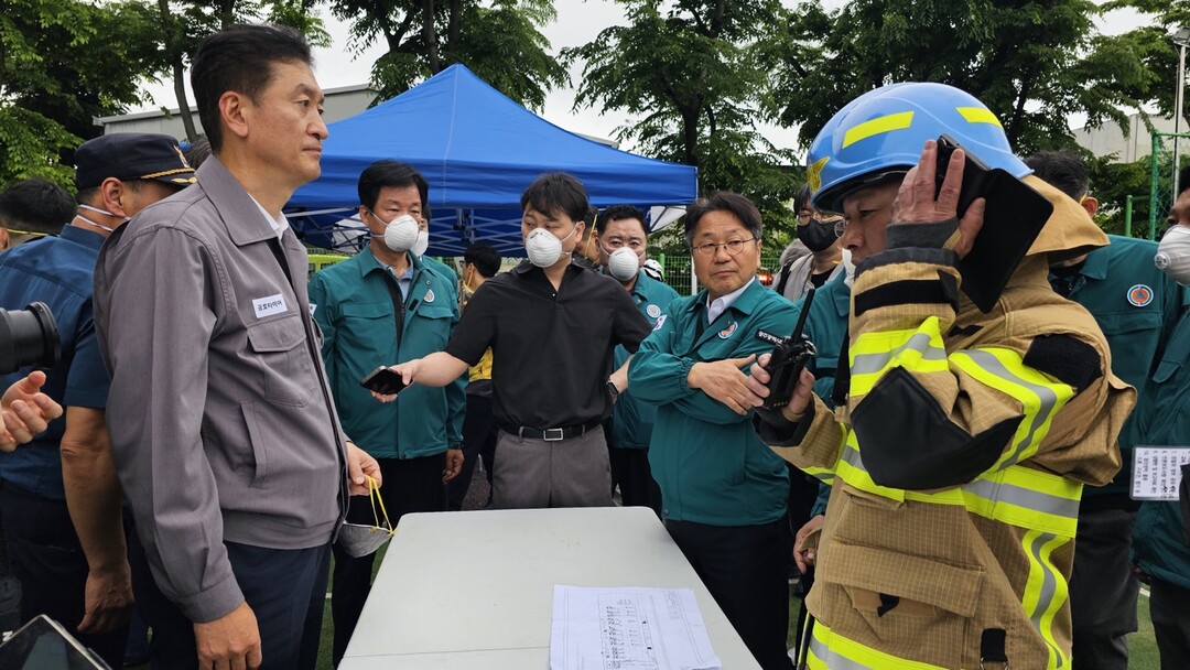 | ▲ 강기정 광주광역시장이 17일 광산구 소촌동 금호타이어 광주공장 화재현장을 찾아 화재진압 과 피해상황 등을 점검하고 있다. [광주광역시 제공] |