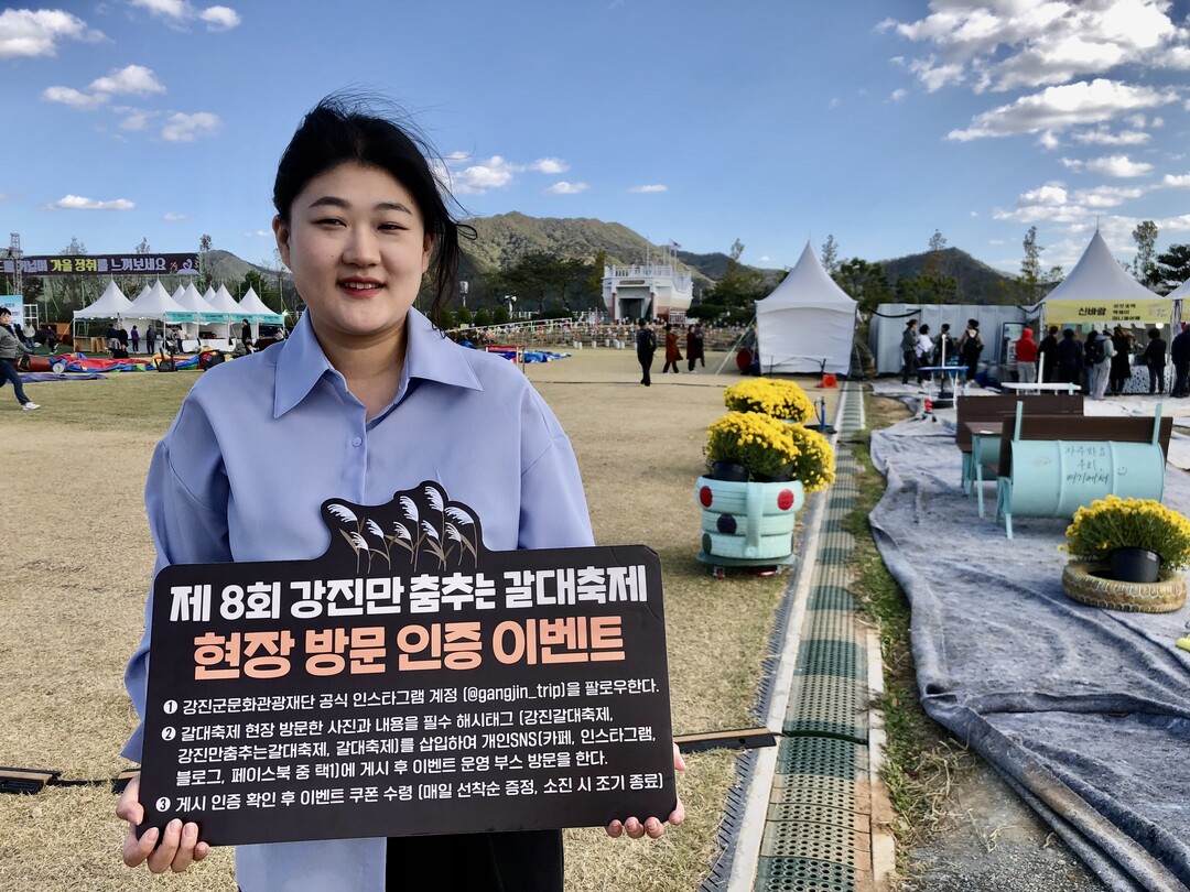 | ▲ 20일 강진군청 직원들이 '제8회 강진만 춤추는 갈대축제' 현장 방문 인증 이벤트를 홍보하고 있다. [강성명 기자] |
