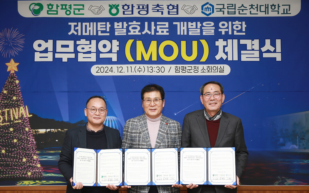 전남 함평군이 함평축산농협, 국립순천대학교와 함께 '저메탄 발효사료' 공동 연구개발을 위한 업무협약을 11일 체결했다.
