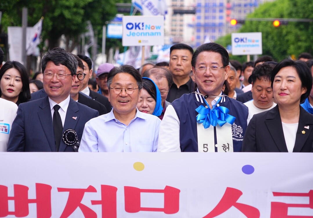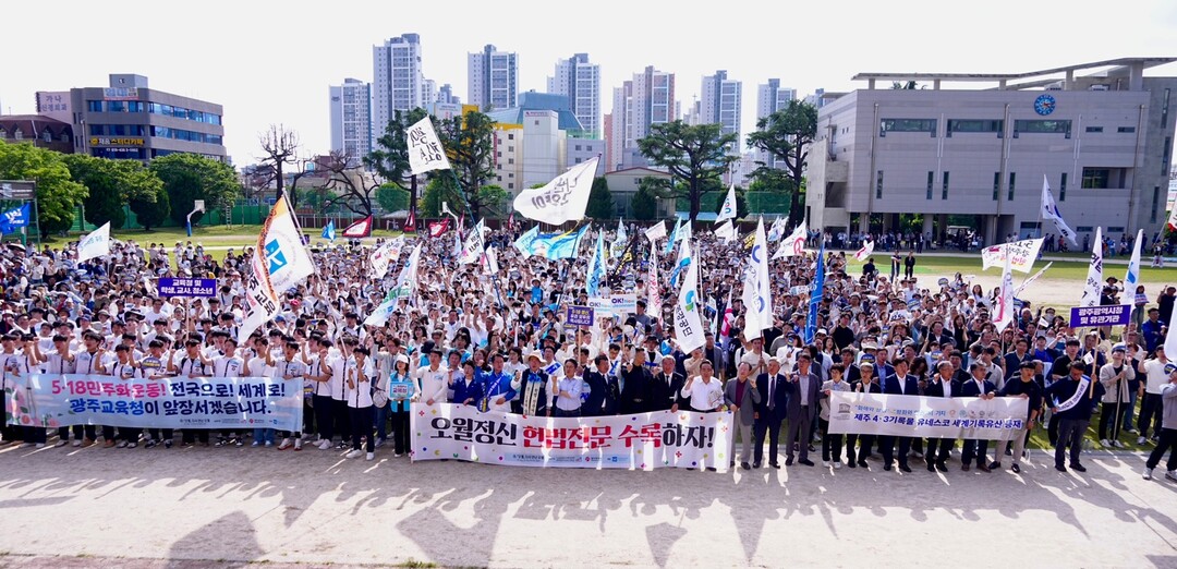 | ▲ 강기정 광주광역시장과 김영록 전남지사가 17일 오후 '민주평화대행진' 출발지 가운데 한 곳인 광주고등학교에서 행진에 앞서 '임을 위한 행진곡' 제창을 하고 있다. [광주광역시 제공] |