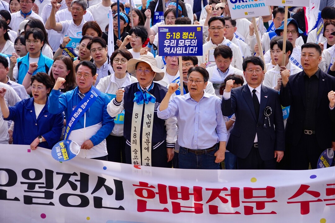| ▲ 강기정 광주광역시장이 17일 오후 '민주평화대행진'에 참석해 '오월정신 헌법전문 수록하자'라는 문구가 새겨진 펼침막을 들고 금남로 일대를 행진하고 있다. [광주광역시 제공] |