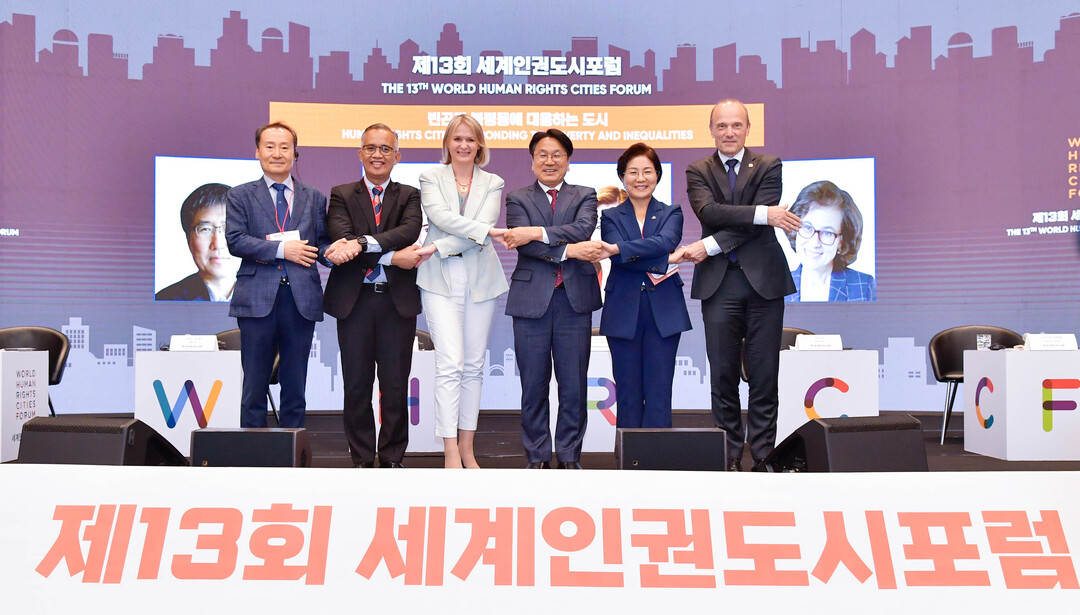 | ▲ 강기정 광주광역시장이 4일 오후 서구 김대중컨벤션센터에서 열린 '제13회 세계인권도시포럼' 라운드테이블에 참석해 발표에 앞서 기념촬영을 하고 있다. (왼쪽부터 김중섭 세계인권도시포럼 위원장, 수마스트로 인도네시아 싱카왕 시장, 카롤리나 즈드로도브스카 폴란드 바르샤바 부시장, 강기정 광주시장, 김미경 은평구청장, 모르텐 샤에름 라울발렌베리인권연구소장) [광주광역시 제공] |