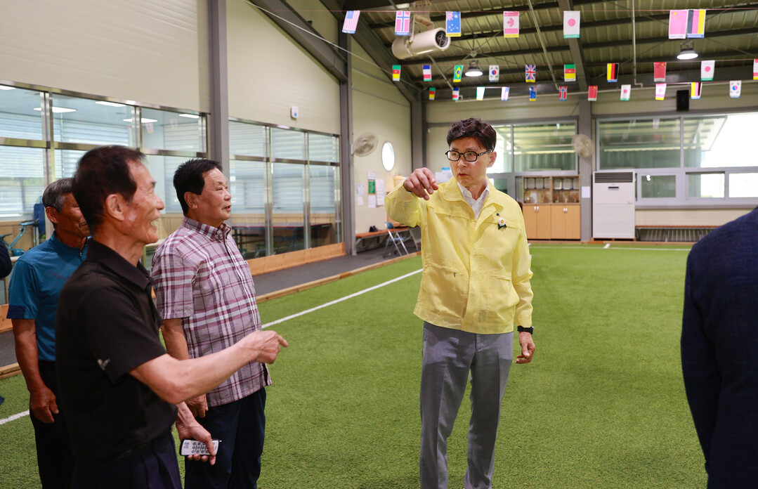 | ▲ 김철우 보성군수가 지난 14일 지속적인 폭염에 대응하기 위해 고령자들이 많이 이용하는 문덕면 실내게이트볼장을 찾아 시설물 점검과 관리 상태를 세심히 살피고 있다. [보성군 제공] |