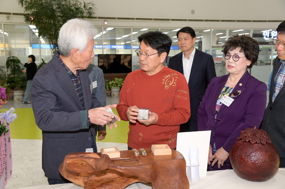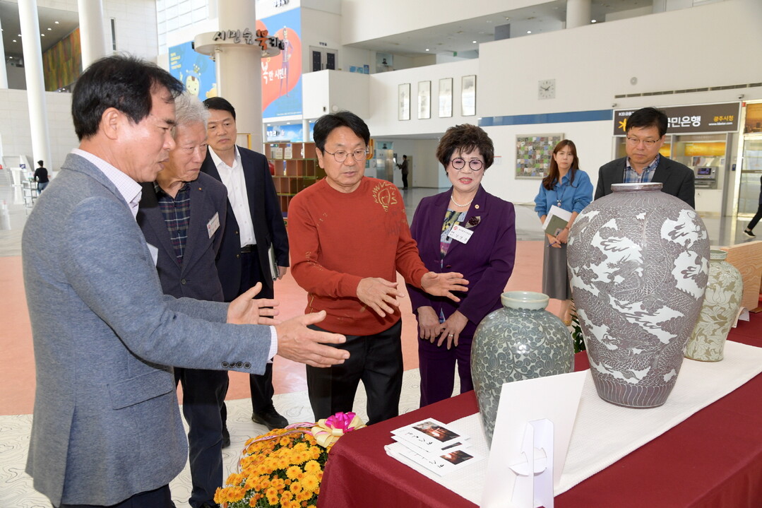 | ▲ 강기정 광주광역시장이 25일 오후 시민홀에서 열린 제4회 광주광역시명장전 전시장을 방문해 전시된 작품을 관람하고 있다. [광주광역시 제공] |