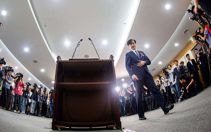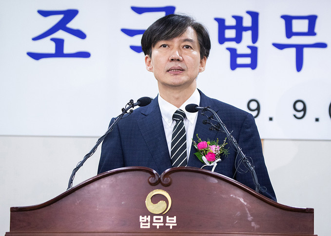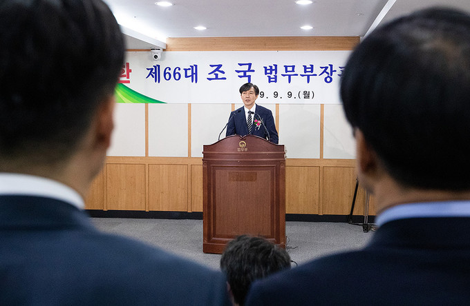 조국 신임 법무부 장관이 9일 오후 경기도 정부과천청사 법무부에서 열린 취임식에서 취임사를 하고 있다.