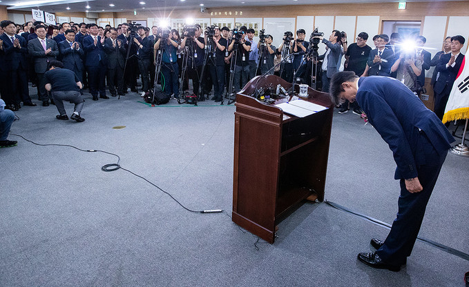 조국 신임 법무부 장관이 9일 오후 경기도 정부과천청사 법무부에서 열린 취임식을 마치고 허리를 숙여 인사를 하고 있다.