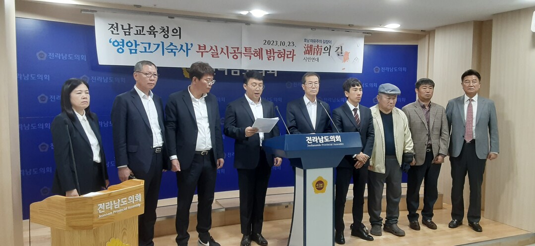 | ▲ 호남의길시민연대가 23일 전남도의회에서 기자회견을 갖고 '영암고 기숙사' 부실시공과 관련 안전진단 업체와 도교육청간의 유착 의혹을 제기했다. [호남의길시민연대 제공] |