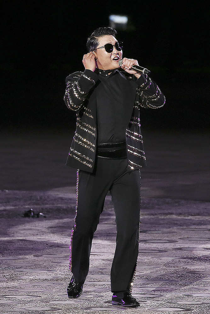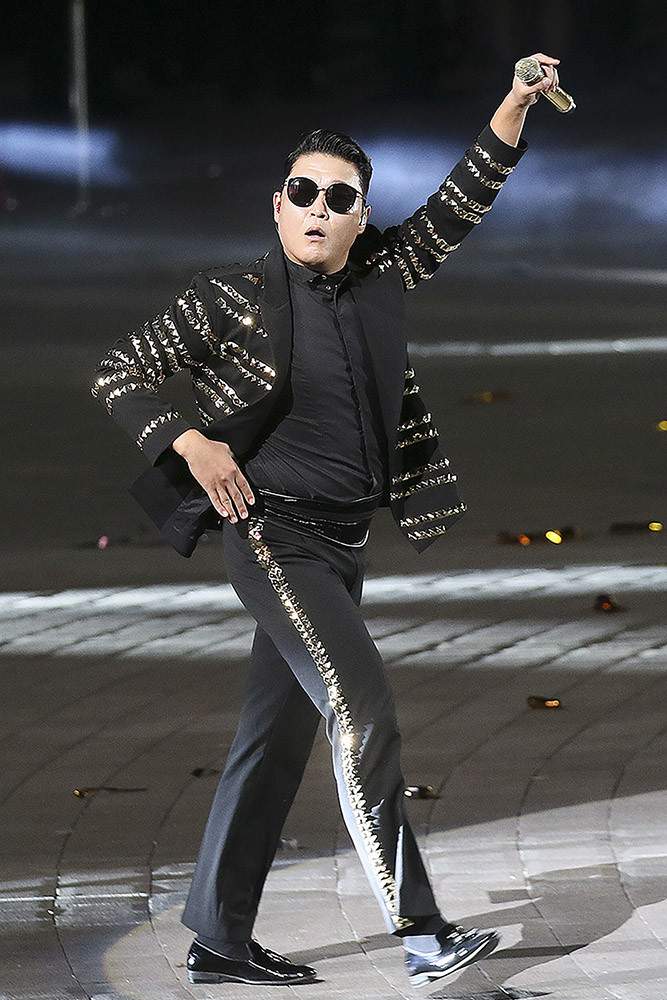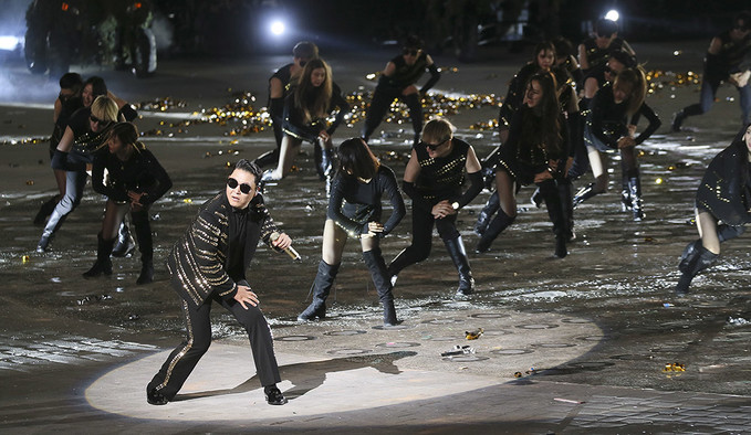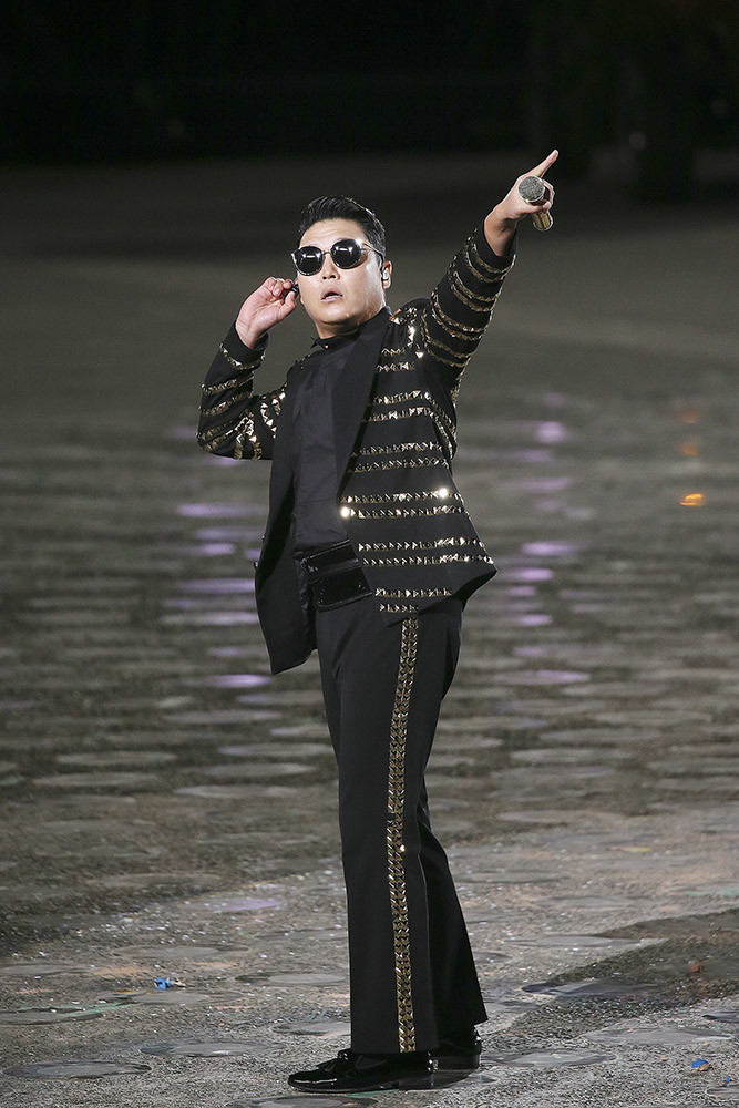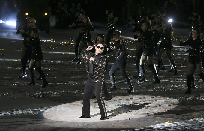 가수 싸이가 1일 오후 서울 용산구 전쟁기념관에서 열린 제70주년 국군의 날 기념식에서 축하 무대를 선보이고 있다.