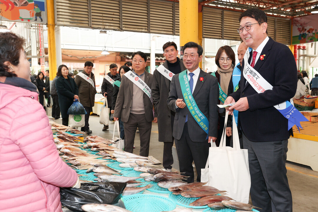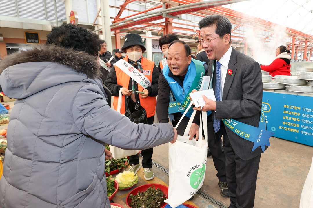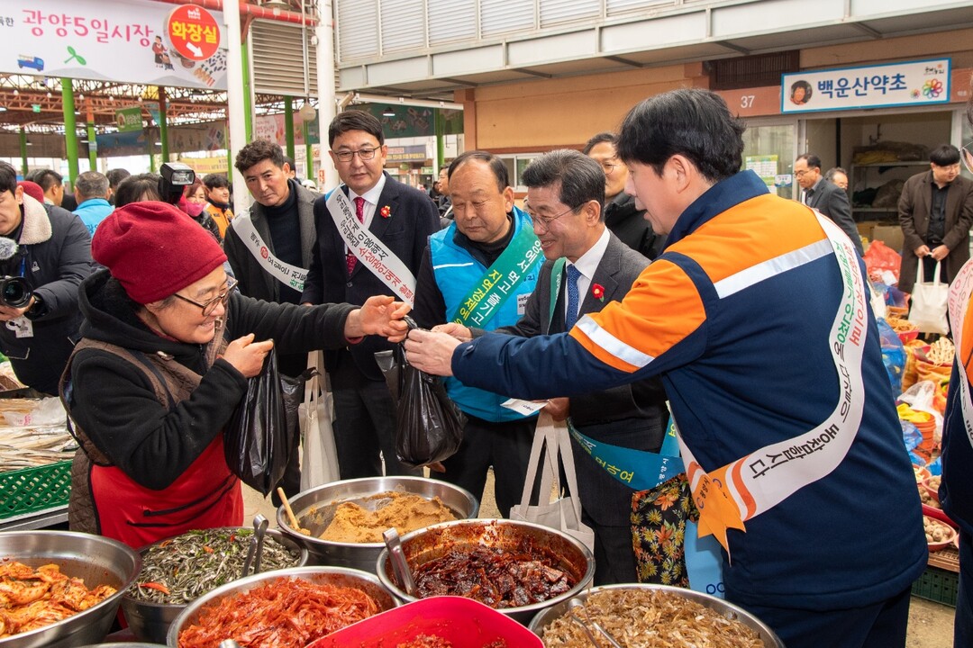 | ▲ 지난 21일 정인화 전남 광양시장이 고재윤 광양제철소장, 우광일 광양상공회의소 회장 등과 함께 광양5일시장을 방문해 광양사랑상품권으로 설 명절 장을 보며 불편 사항과 건의 사항을 청취하고 있다. [광양시 제공] |