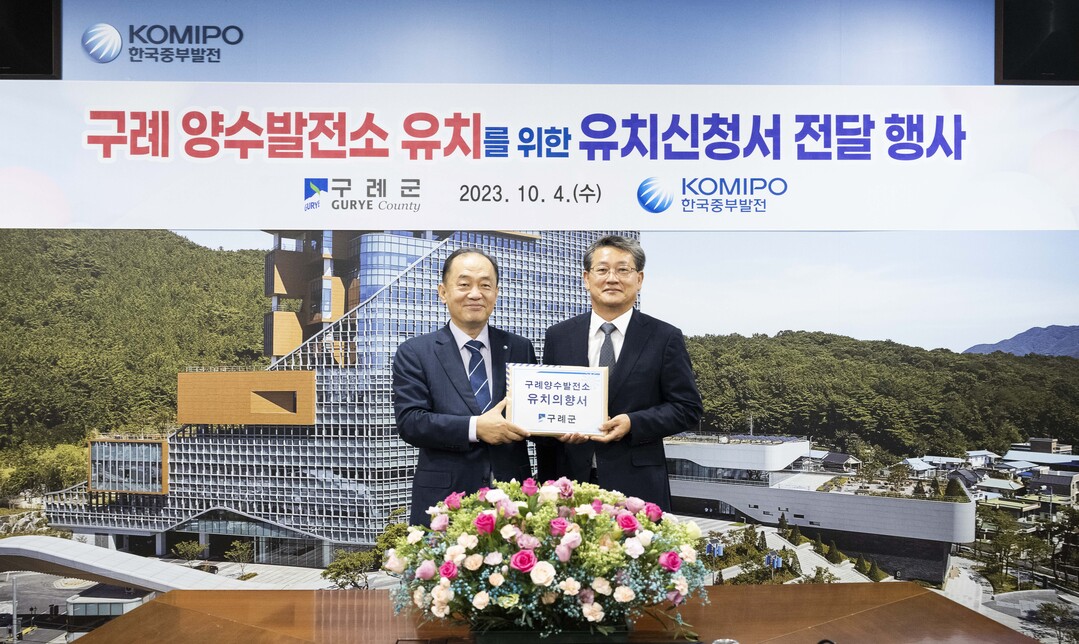 김순호 전남 구례군수가 4일 한국중부발전(주) 본사를 방문해 김호빈 사장에게 ‘구례 양수발전소 유치의향서’를 전달했다.